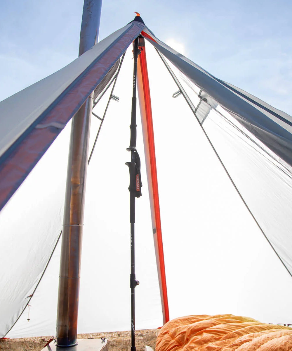 To use the trekking poles as tent pole for any tipi tent of up to 228 cm hight, remove the orange cap on top of the trekking pole handle and connect your two trekking poles using the X3 Adapter.