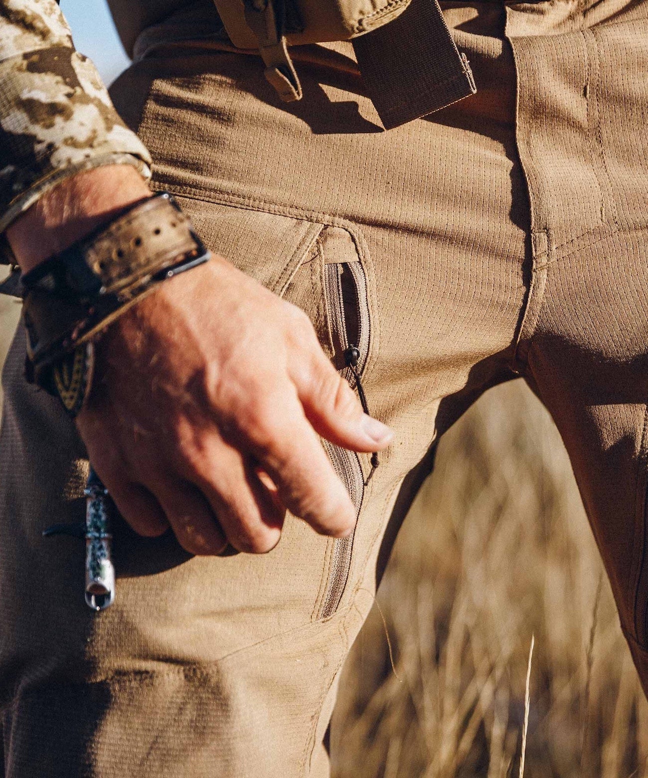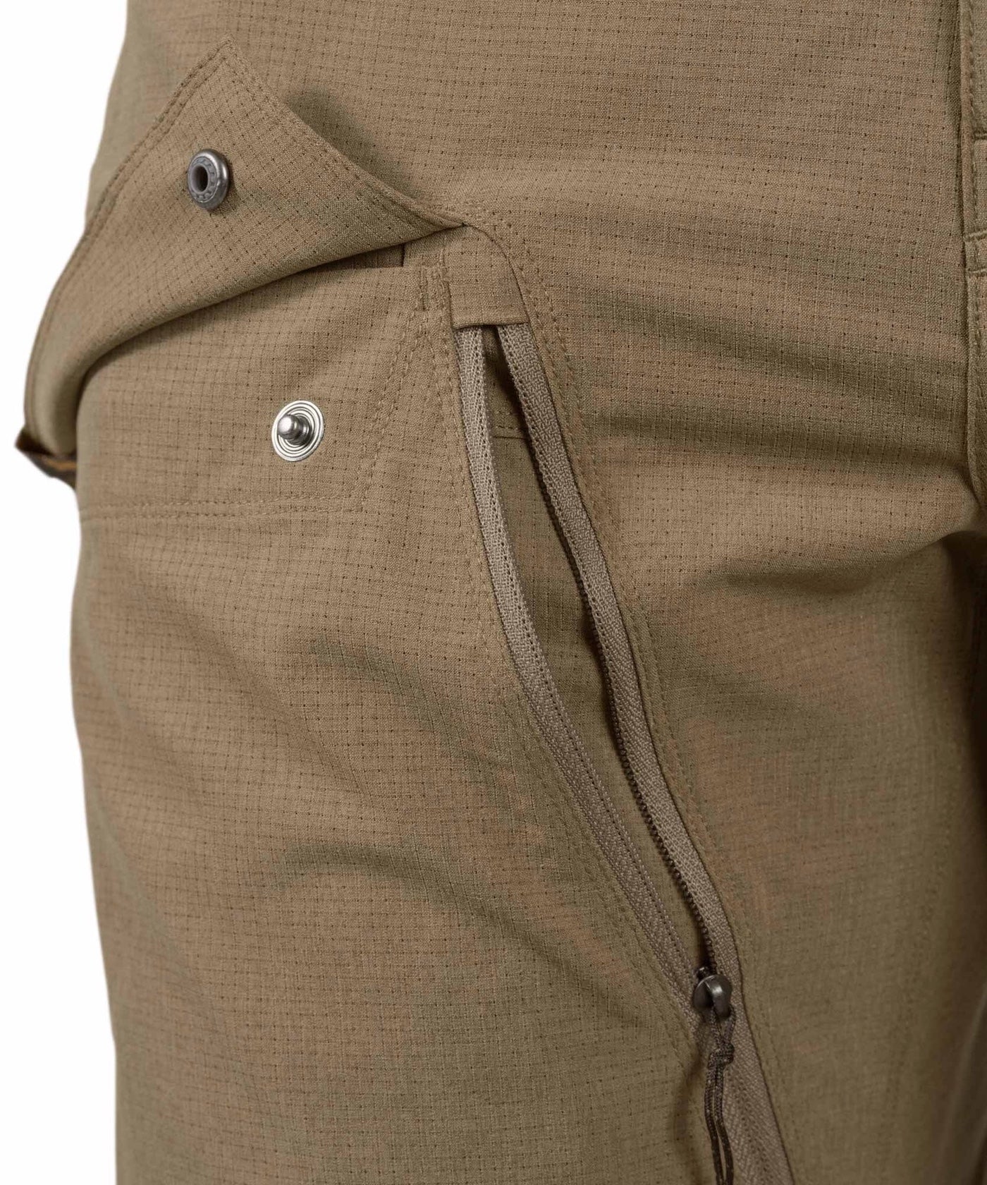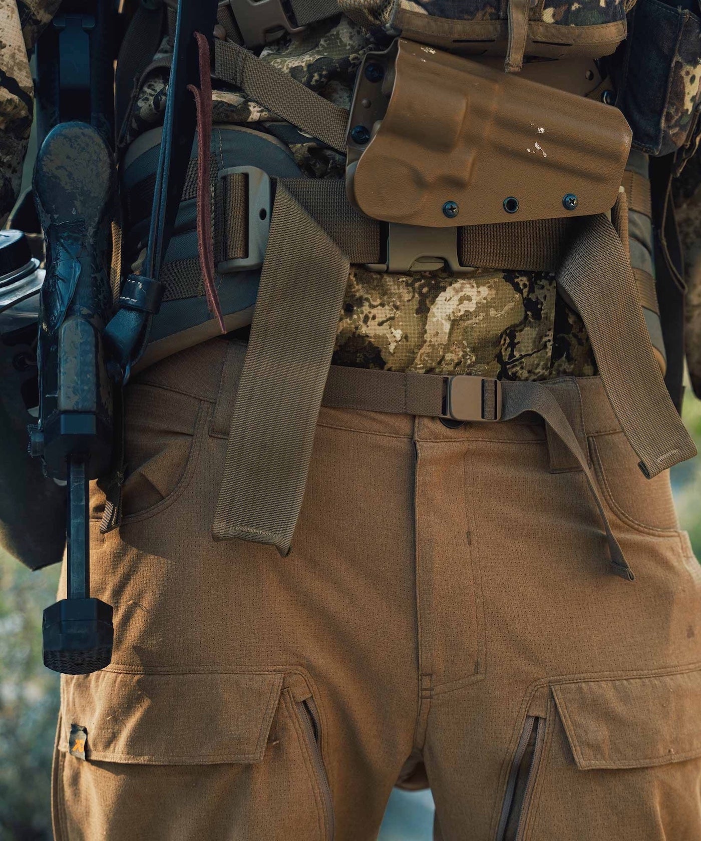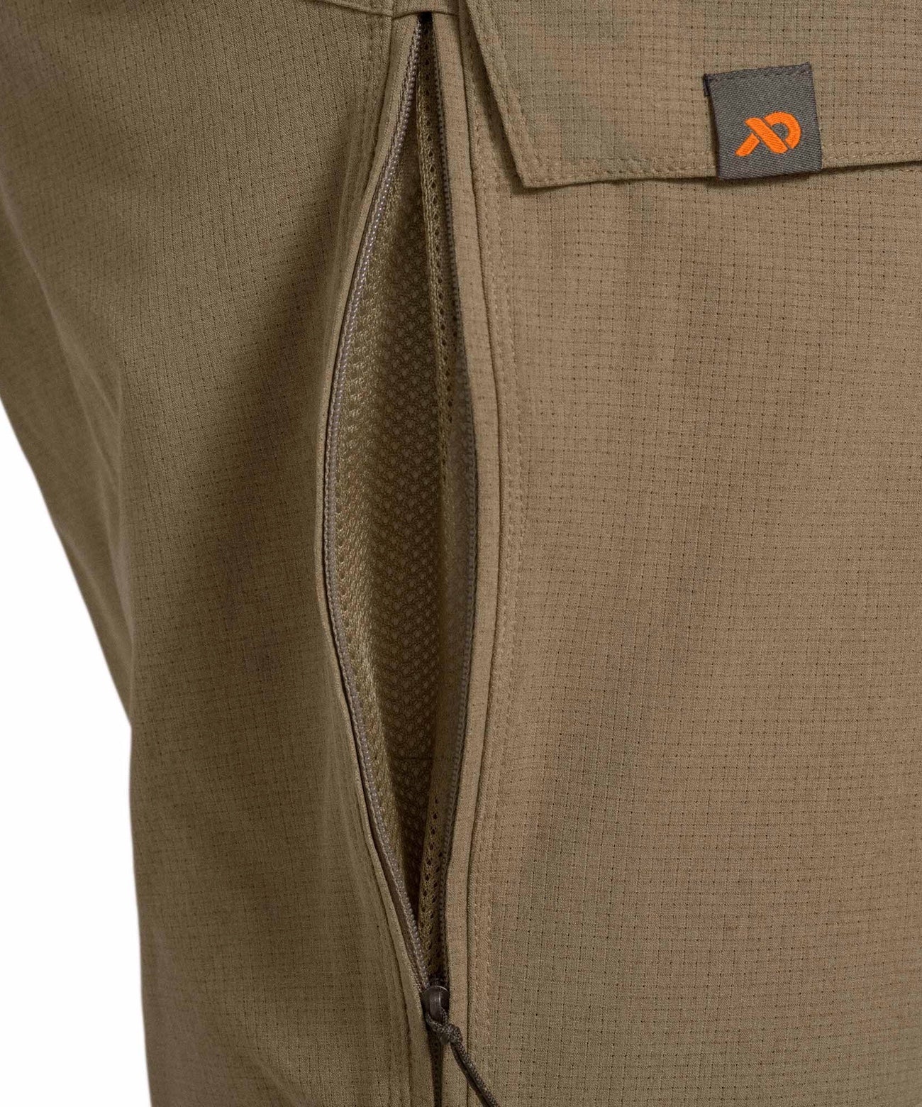 Designed for high-heat, high-humidity hunts, the Trace Pants are purpose-built for early-season conditions that push both temperature and moisture to their limits. The pants are constructed with KineticGrid™ fabric—engineered for airflow while maintaining durability—and treated with HeiQ Pure Odor Control Technology for long-lasting scent management. The result is a silent, ultralight system that maximizes breathability without sacrificing performance. The Trace Pant features seated-accessible top- and side-entry cargo pockets, with a zippered side-entry cargo pocket that also functions as a secondary ventilation point when used with the hip vents. Zippered rear wallet pockets offer secure storage, while jean-style front pockets include an integrated knife sleeve for quick access. A low-profile integrated belt is pack-belt compatible.